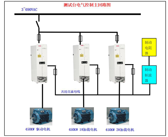 驅動橋試驗臺在滿足工藝要求的前提下,盡可能的采用既可靠又經(jīng)濟的電氣傳動方案。本系統(tǒng)采用變頻共用直流母線式制動(直流母線連接+斬波制動電阻單元)控制方案。本方案選用高性能的ABB-ACS800變頻器、ABB電機、ABB制動單元和制動電阻組成高性價比的傳動系統(tǒng)。請參閱《測試臺電氣控制主回路圖》