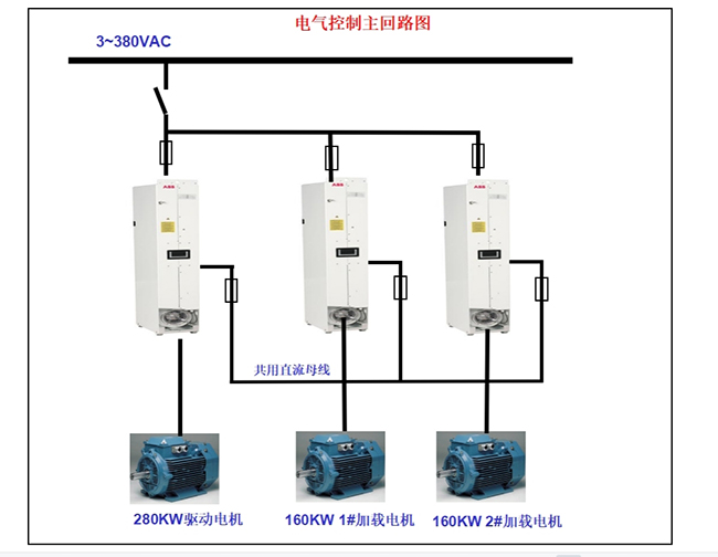 一臺變頻器(驅(qū)動變頻器)控制驅(qū)動電機運行轉(zhuǎn)動,通過聯(lián)軸器(減速機)帶動加載電機轉(zhuǎn)動。通過另二臺變頻器(加載變頻器)的控制,使加載電機處于力矩加載發(fā)電狀態(tài),其發(fā)出的電能經(jīng)加載ABB變頻器的IGBT整流單元,輸出直流電,直接與驅(qū)動變頻器的直流母線連接,經(jīng)逆變后轉(zhuǎn)換成三相交流電供給驅(qū)動電機。使整個系統(tǒng)的電能形成一個內(nèi)部交流循環(huán),從而達到節(jié)能目的。